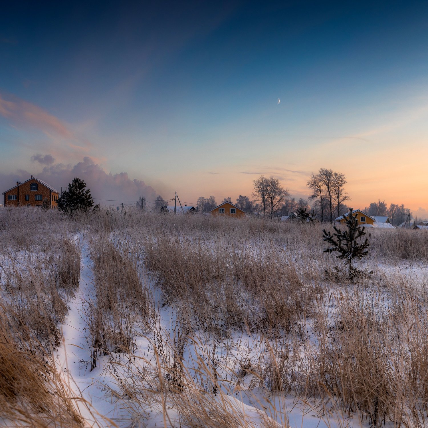 поле, дорога, зима, холодно, луна, месяц, зима, декабрь, деревня, киров, вятка, пригород, глубинка, россия, ярко, вечер, закат, солнце, небо, ель, ёлка, снег, снежно, зябко, Панагушин Сергей