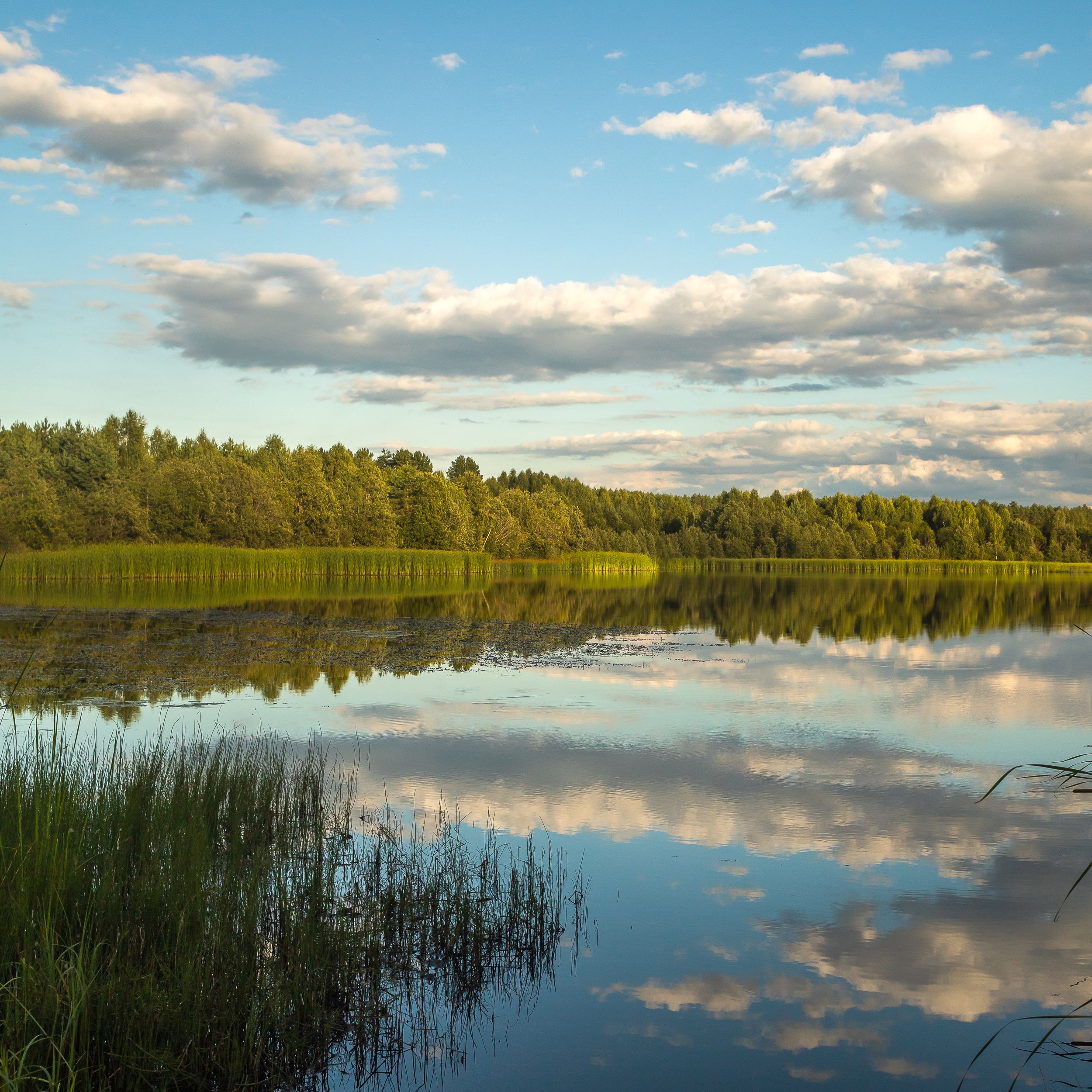 отражения, свет, вечер, лето, август, тепло, тихо, пруд, водоем, небо, облака, береза, поле, лес, тишина, панорама, пейзаж, природа, трава, вода, Панагушин Сергей