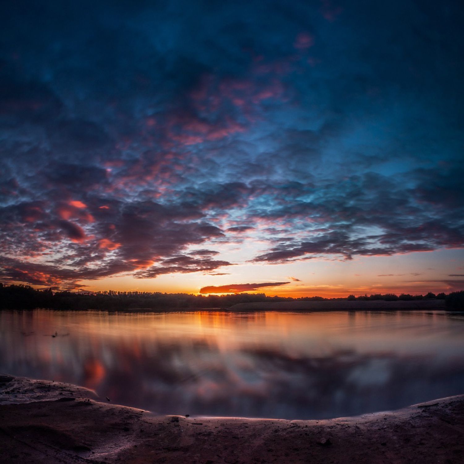 вечер, закат, лето, тепло, водоем, озеро, пруд, отражения, небо, тучи, облака, лес, горизонт, ярко, берег, купаться, солнце, , Панагушин Сергей