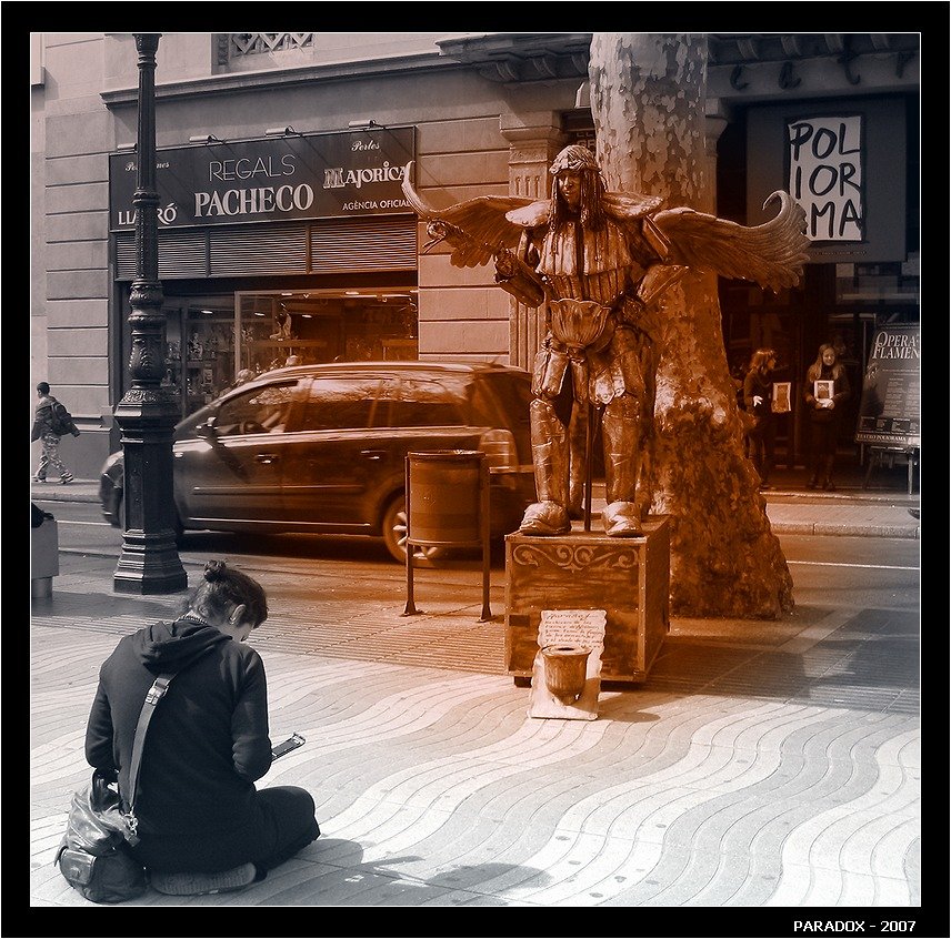 На бульваре Рамбла в Барселоне живых скульптур больше, чем в Париже. Этот аттракцион придумали три клоуна - Тонио, Пе-пе и Пако. Большинство актеров - латиноамериканцы, летом их доход достигает 3 тысяч евро в месяц. Тематика самая разнообразная - от скульптуры средних веков до современного модерна. Власти Барселоны намереваются ограничить деятельность этих актеров, устроив просмотры и выдачу обязательных разрешений ...