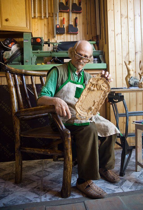 Вы правы. В исходнике все есть. Это чистый художественный репортаж. Я его попросил взять что-нибудь в руки и очки немного сдвинуть на нос и все. Свет естесственный через ворота справа. Никаких отражателей и.т.д не было. Кстати очки он сам сделал из дерева ;)