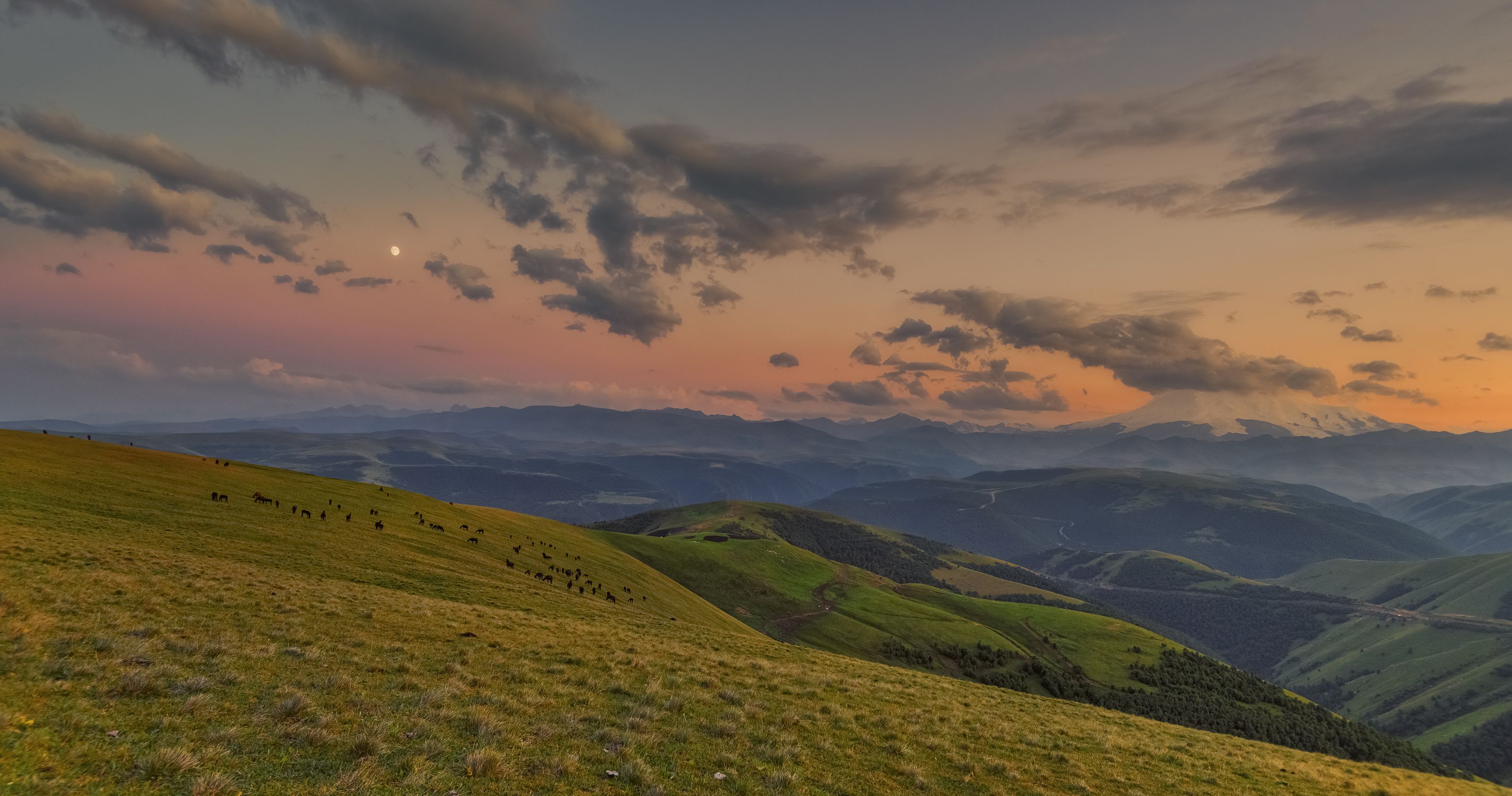 Вид на прикрытый Эльбрус, в километре от дороги на Джилы-Су. Август 2021 г.
