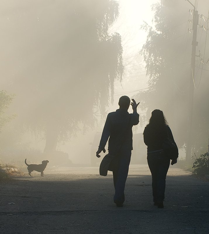 осень, туман, рассвет, девушка, юноша, собака, беседа, Андрей Алексеев