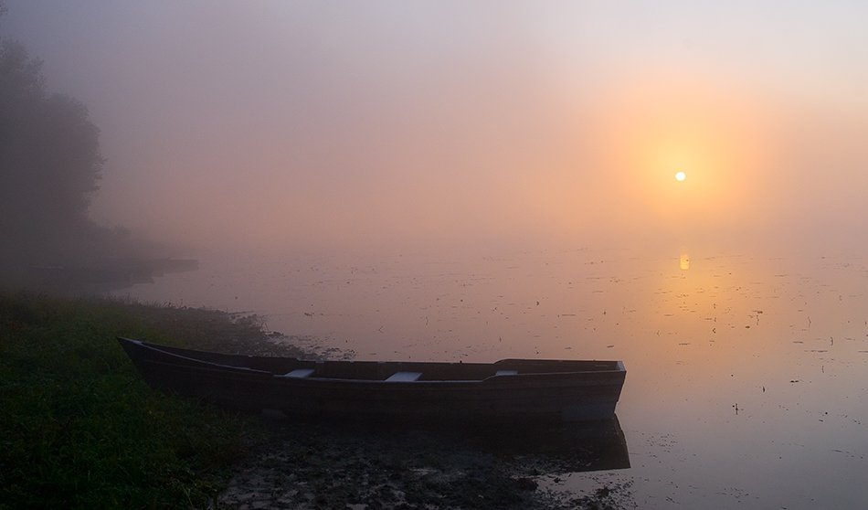 осень, туман, рассвет, солнце, лодка, деревья, отражения, Андрей Алексеев