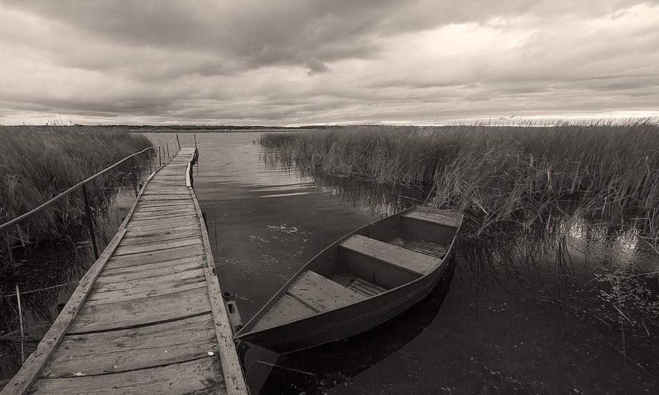 осень, озеро, лодка, мосток, облака, Андрей Алексеев