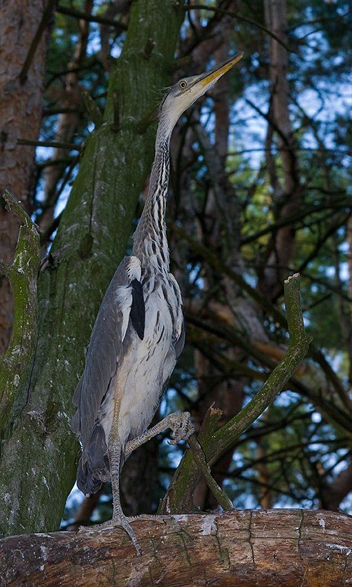 Сьёмка в июле в Панинском лесу Рязанской области. Цаплёнок выпал из гнезда и сидел на поваленном дереве на высоте 3 метров. Летать он не мог и только сидел и гордо смотрел вперёд с независимым видом. И хотя родители спускались к нему и кормили его он был уже обречён. Я посещал этого цаплёнка два раза и фотографировал его, на третий мой приезд, через 4 дня под деревом лежали недоеденные лисой перья. Закон природы...