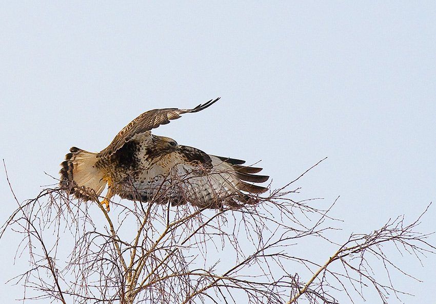 Мохноногий канюк или зимняк, самый северный представитель канюков, Buteo lagopus - пролётный и зимующий вид в районе Окского заповедника. Осенью он обычно появляется в начале октября и в благоприятные для него годы - малоснежные зимы с обилием мышевидных грызунов - встречается в течение всей зимы. Птиц в это время можно видеть летающими над лугами или сидящими на стогах сена или вершинах деревьев. Красивый хищник, размах крыльев у него достигает до полутора метров и вес до полутора килограмм.