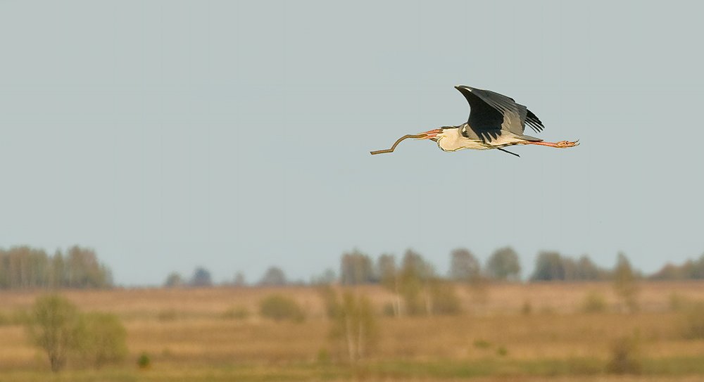Стоял в "засаде" в камуфляже под деревом недалеко от леса, где расположена колония серой цапли. Птицы периодически спускались к ближайшему озеру и взлетали обратно с добычей, то рыбку поймают, то веточку прихватят. Летали они мимо меня, а я старался стоять незаметно и снимать процесс пролёта. Дополнительно применялся телеконвертер Никон 1,7.