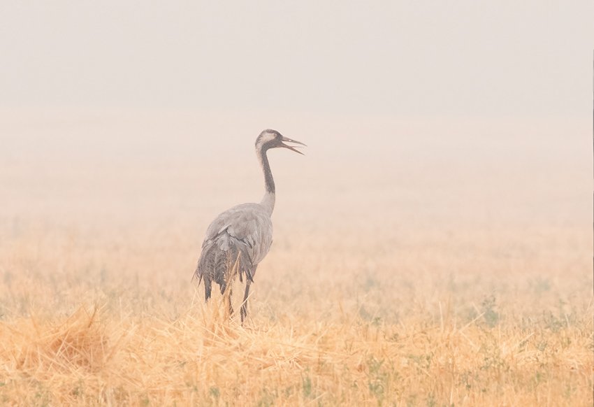 Рязанская область, сплошные пожары на территории Окского биосферного заповедника в безветренную погоду закрыли всё сплошной пеленой дыма. Журавли кормятся на полях скошенной озимой ржи. Жарко, около 35 градусов, душно, сильный дым. Они почти все стояли с открытыми клювами. Фотоохота из машины, так как пешего человека они ближе 100 метров не подпускают, а на машине я подъехал примерно на 50 метров. Снято на Nikon D300S, объектив Nikkor 70-200f2,8 + конвертер Nikon 1,7X