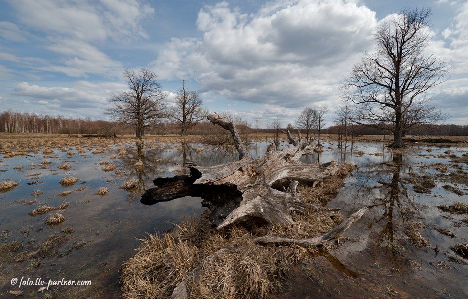 весна, разлив, дубы, коряга, облака, Андрей Алексеев