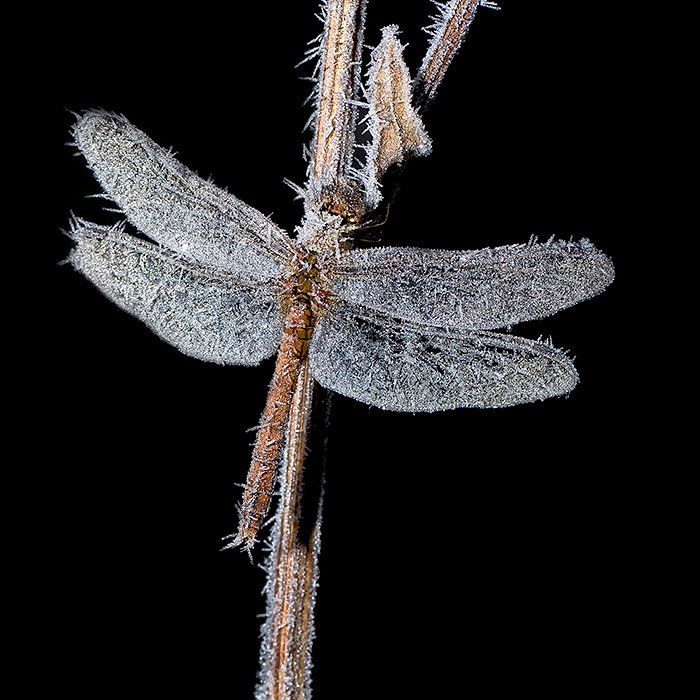 Есть несколько вариантов сьёмки, есть и без вспышки. Там мягче и менее контрастно. Этот выложил как более броский, резкий контраст чёрного фона и серебристого инея на стрекозе. Напечатал оригинал в размере 40х40 см. Смотрится намного лучше, на сайте ведь сжатое превью... Снимаю всегда только в РАФе, обрабатываю в PSD, печатаю с ТИФа. Про джипег вспоминаю только когда выкладываю на сайты. Спасибо за внимание к моим работам и критику.