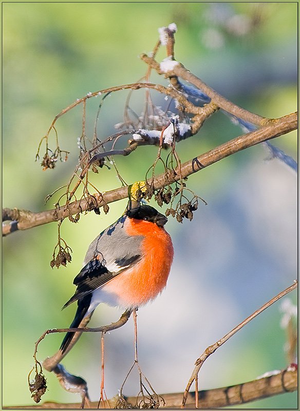 Был удачный морозный и солнечный день. Приходилось при сьёмке одевать белый камуфляж и долго стоять в ожидании удачного ракурса (снегири постоянно перелетали с ветки на ветку). В тот день чуть не отморозил руки... По закону подлости уже когда замёрз окончательно прилетают снегири и появляется возможность снимать при удачном ракурсе...