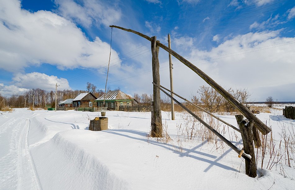 Этому колодцу уже больше ста лет... В 70-х годах сняли верхние деревянные венцы и поставили кольца. А снизу в воде уже морёный дуб... Справа виден лес на ЗП - это уже лес вдоль Оки. По этим полям за огородами домов зимой часто можно встретить волков. Недавно волки ночью загрызли прямо возле дома собаку, которая не успела от них спрятаться...