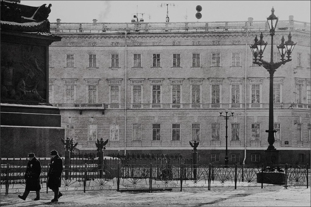 композиция как раз хреновая. Притягивающие взгляд объекты находятся по краям кадра crop(20,390,277,674) и crop(796,12,1011,644) , а взгляд упирается в серую однообразную стенку генштаба... Бывают кадры, где такое построение может быть оправданно, но это явно не здесь.