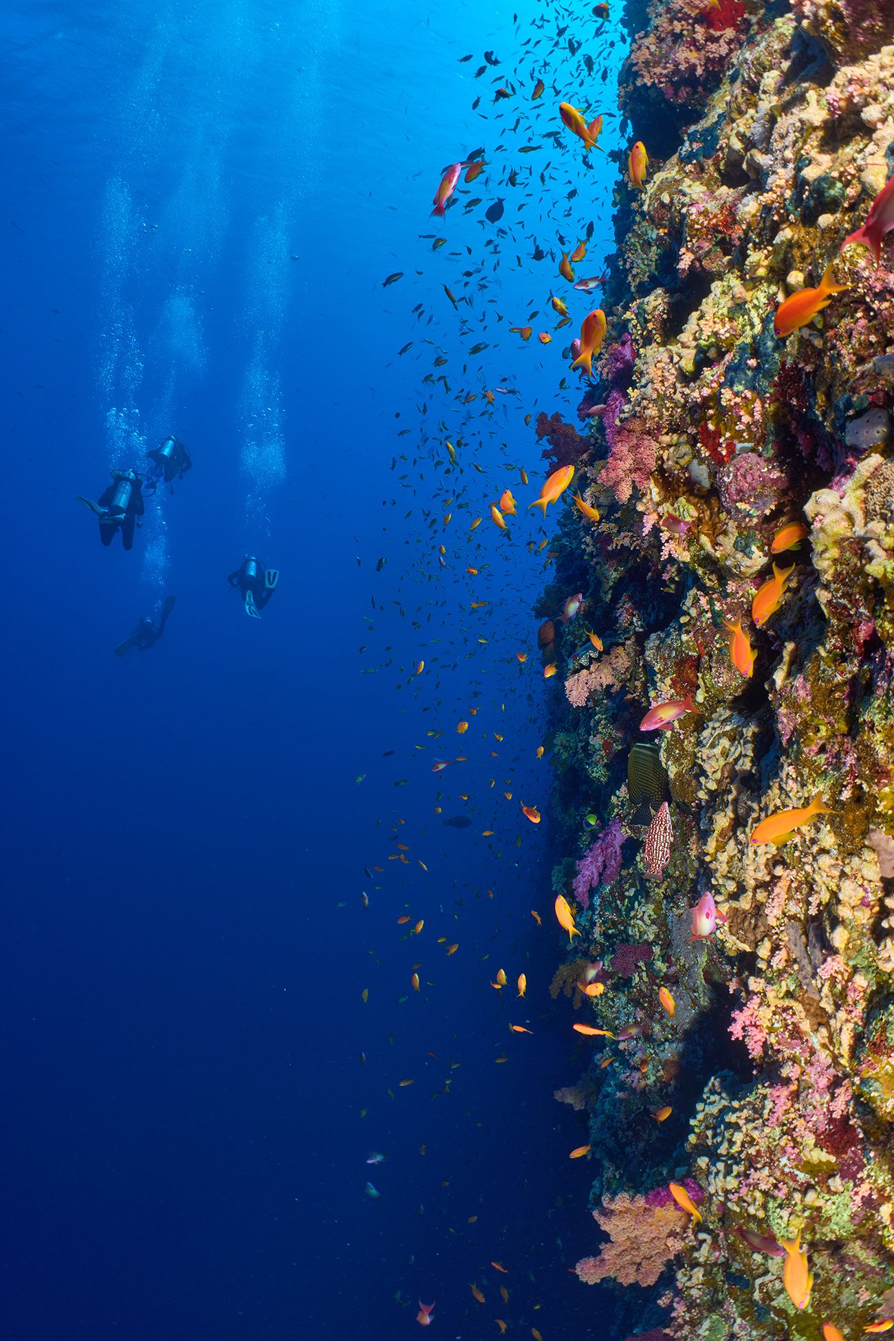 Вертикальные стенки в Красном море живописны и населены различными обитателями. Конкретно эта стенка уходит в глубину до 700-800 метров, а фото снято на глубине около 25-30 метров.