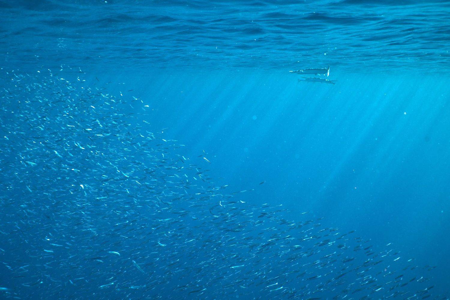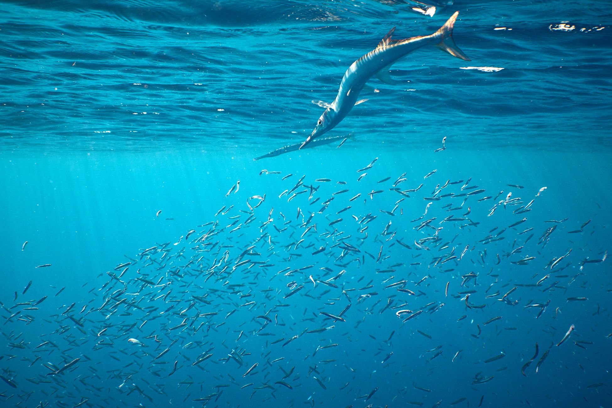 Красноморские тилозуры (сарганы) на охоте. Ход анчоуса, Красное море, Египет, октябрь 2022.