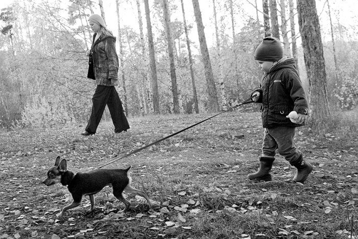 И с другой стороны, получается малышу доверили, как взрослому, выгуливать собаку, но мама далеко не отходит, приглядывает. Этакий треугольник взаимоотношений.