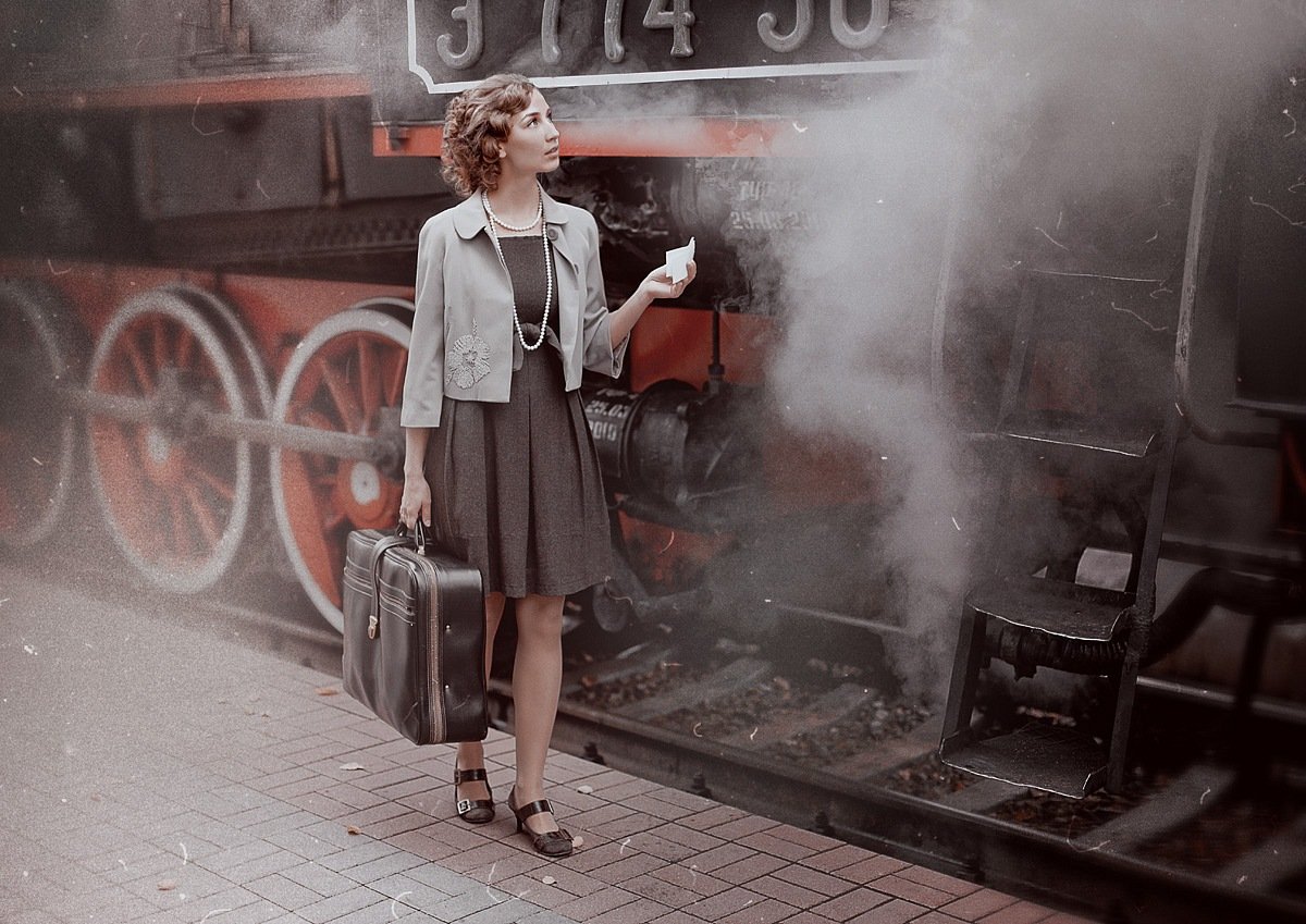 далеко она уедет на таком,мемориальном :) Исполнение хорошее.На мой взгляд реквизит не совсем подходит к задумке:туфли,чемодан не той эпохи..Брусчатка ...