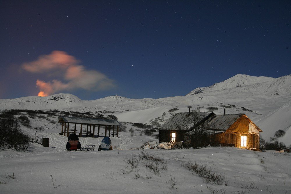 Камчатка, домик вулканологов на реке Толуд под вулканом Толбачик, в темное время суток видно зарево извержения.