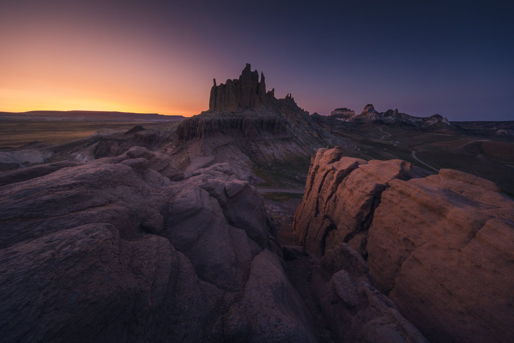 The light hits the rock just right—warm on the edges, cool in the shadows. The foreground leads you in, then the spires rise like fingers against the fading sky. Solid composition, strong textures. 🌄