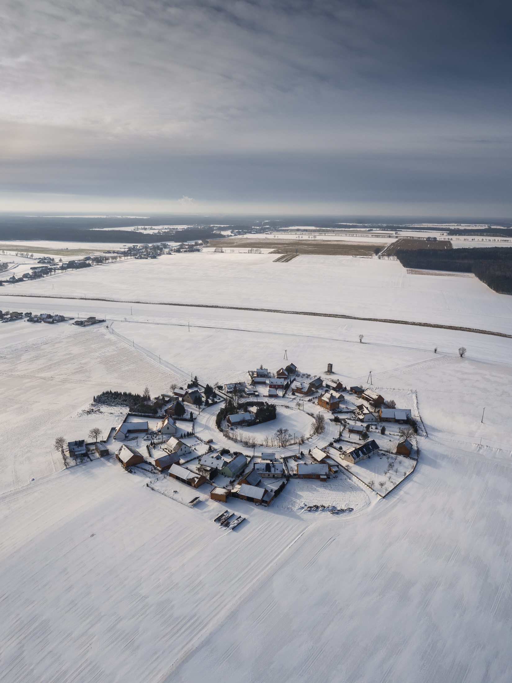 Pawel, what drew you to this particular angle — the curve of the settlement or the way the light hits the snow?