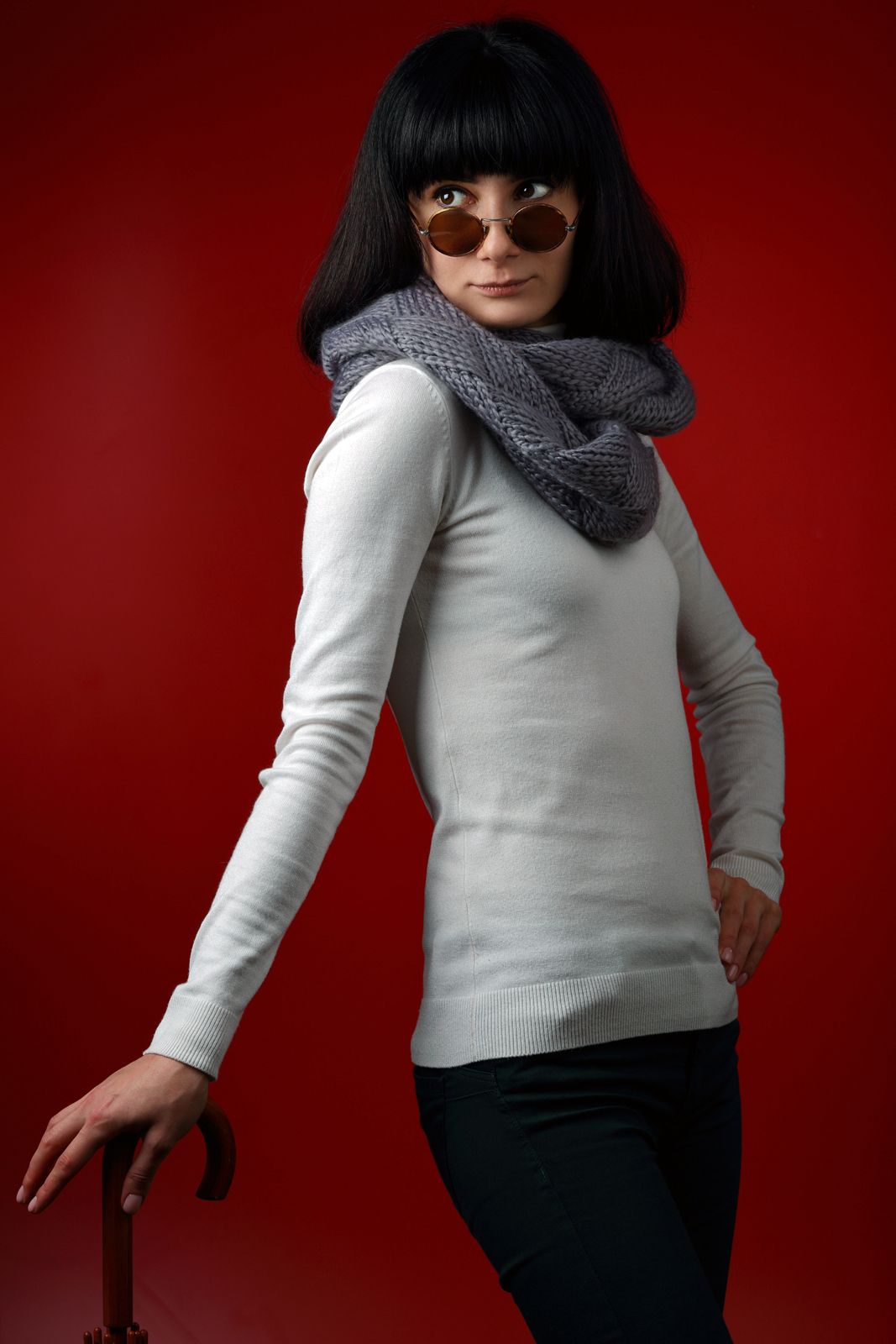 девушка, модель, красивая, стройная, стиль, зонтик, красный фон, шарф, очки, Игорь Парсаданов