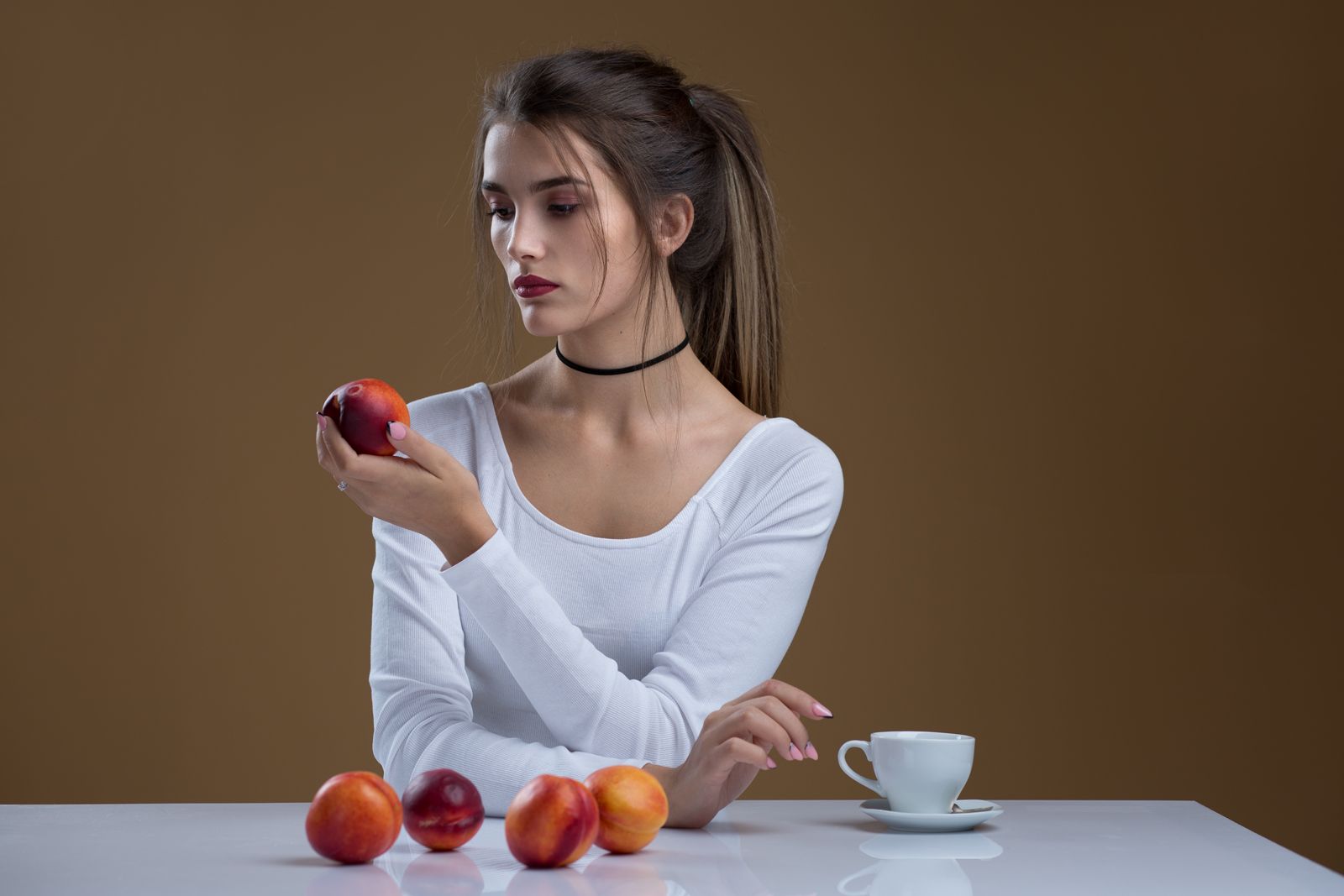 девушка, красивая, стройная, персики, модель, стиль, актриса, студия, портрет, взгляд, бежевый фон, Игорь Парсаданов