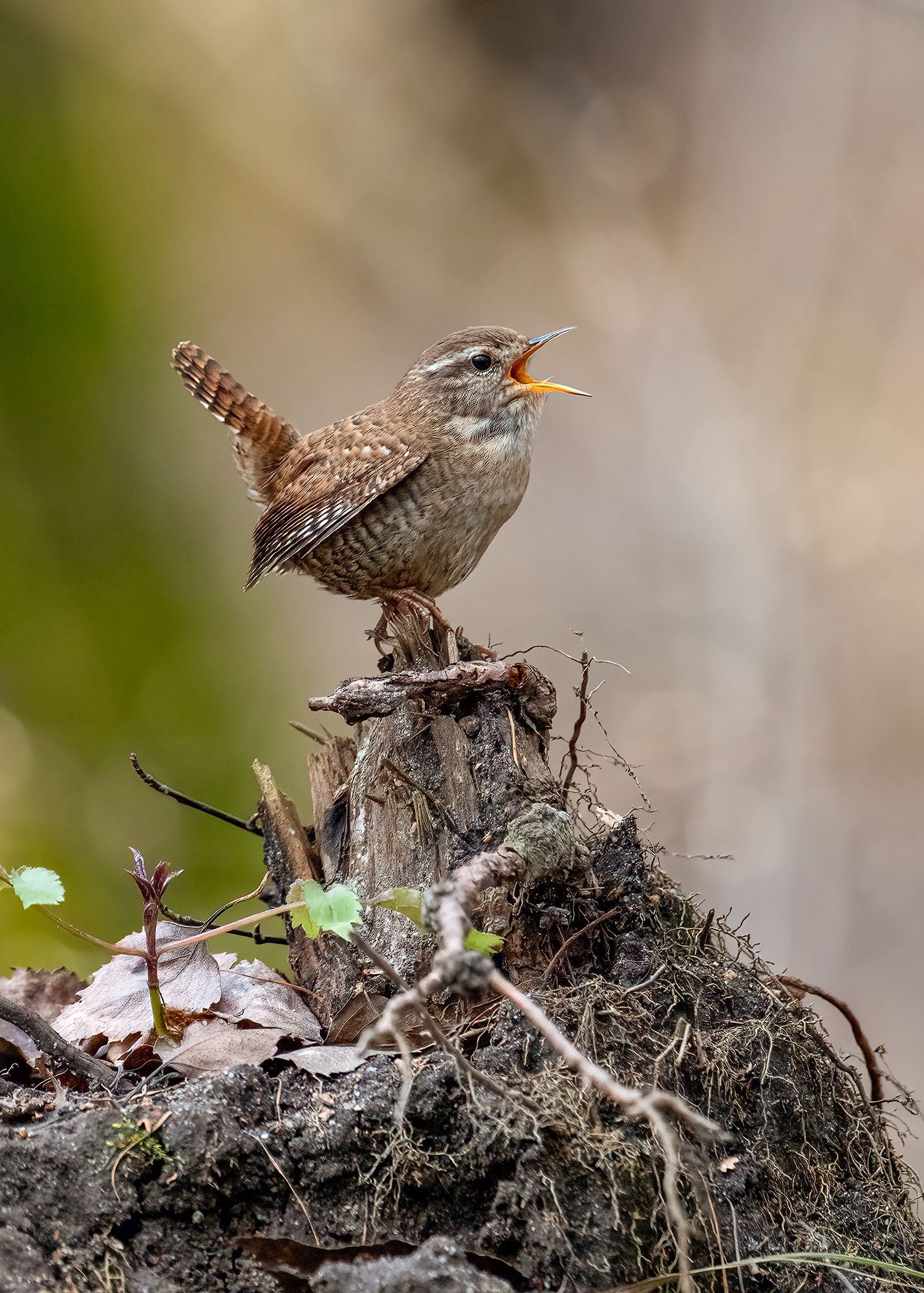 A small wren perches alert on a weathered stump, beak open mid-song, with soft light highlighting its textured feathers and the subtle green of new growth peeking through the earth — a quiet moment full of life. 🐦