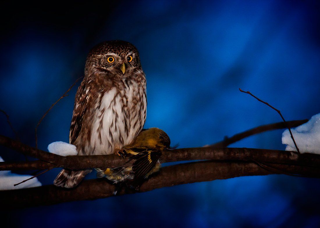 Снимок сделан в Сокольниках, сычик удачно поохотился на самца чижика.