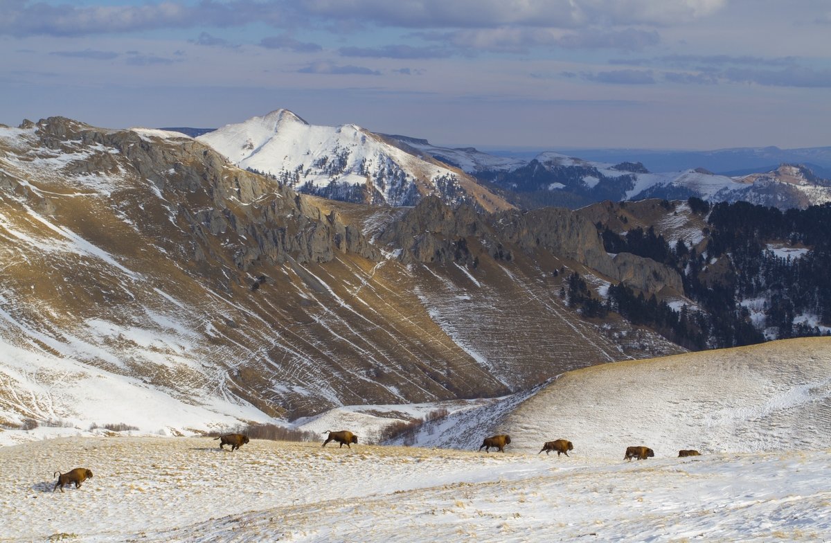 Однажды мне удалось довольно близко подобраться к стаду зубров и долгое время оставаться незамеченным. Когда съемка телевиком наскучила, я сменил его на широкоугольный объектив. Через некоторое время зубры меня заметили и собрались убегать. Волею случая они выстроились замечательной дугой, которую я вряд ли бы смог снять телевиком. Снимок экспонировался на финальной выставке "Дикая природа России 2012".