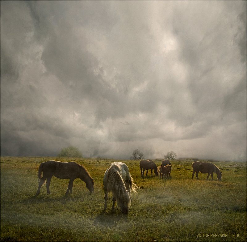 байкал, берег, лошади, туман, травы, Виктор Перякин