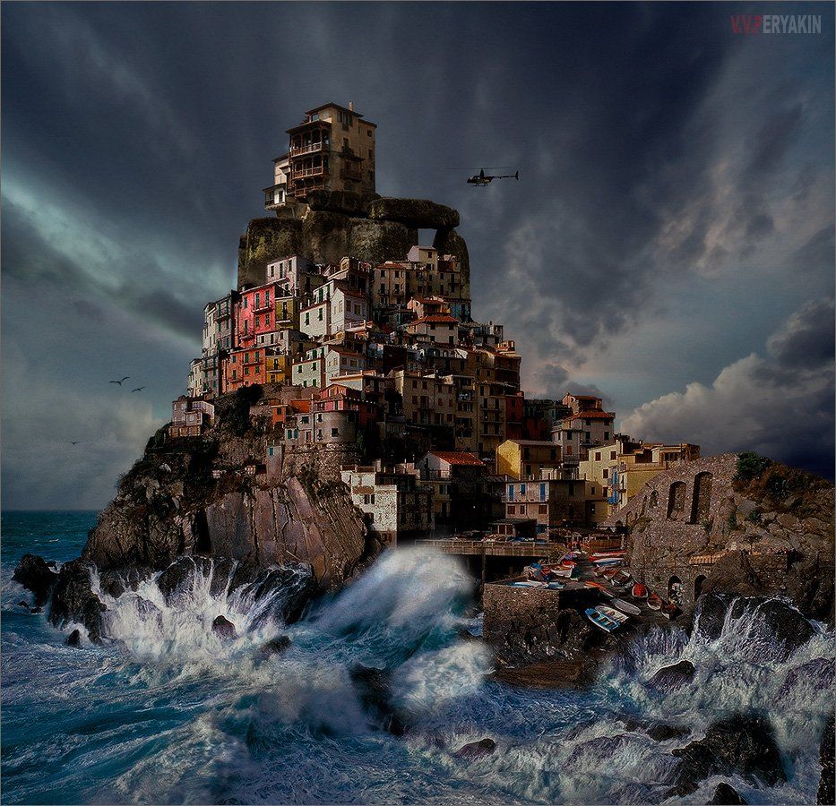 Это Италия, г.Манарола, Чинкве Терре, кусок отрезан, сжат и отражен зеркально, а на вершине домик достроен) Горы еще вырезаны)