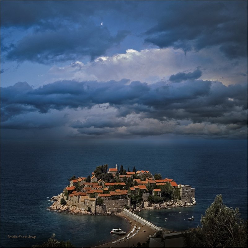 Это остром Святого Стефана . Одно из чудес Черногории. Нет ни одного тур. буклета, без его изображения. Мечтал оказаться около него много лет. При первой встречи -потерял дар речи, онемел от счастья!!