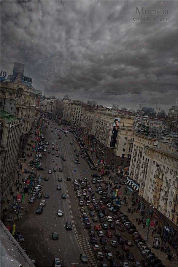 У меня неоднозначное ощущение от просмотра. Во-первых, с освещением явно не повезло. Все одинаковой освещенности. Что края, что центр. Перспектива из-за этого потерялась. Причем, я думаю, что это результат обработки, т.к. вряд ли может быть так, что небо и улица имеют одинаковый уровень освещенности. Даже снег на крыше - 50% серый. Зато снежинки - белые, как будто подсвечены вспыхой. Это второе что смутило, т.к. и крыша должна быть светлее в таком случае.
