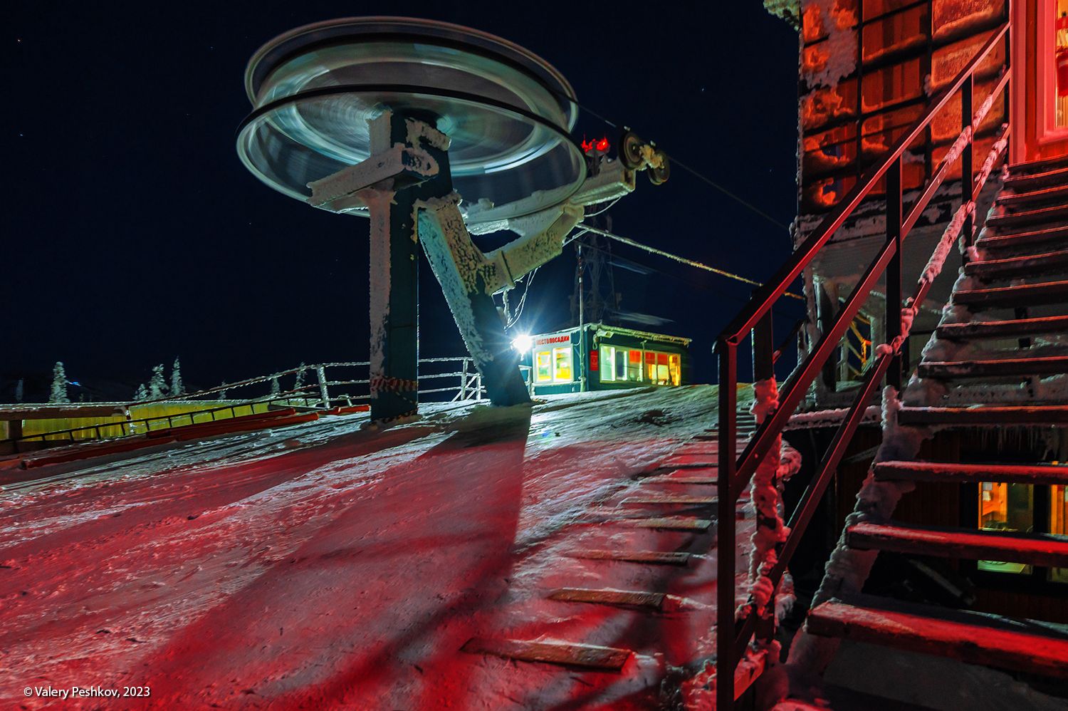Моё любимое кафе на горе Зелёной в красивое время суток. И тут же наше всё: подъёмник Фристайл, метко названный Сатаной за то, что работает почти при любой погоде. Что в Сибири особенно ценно…)