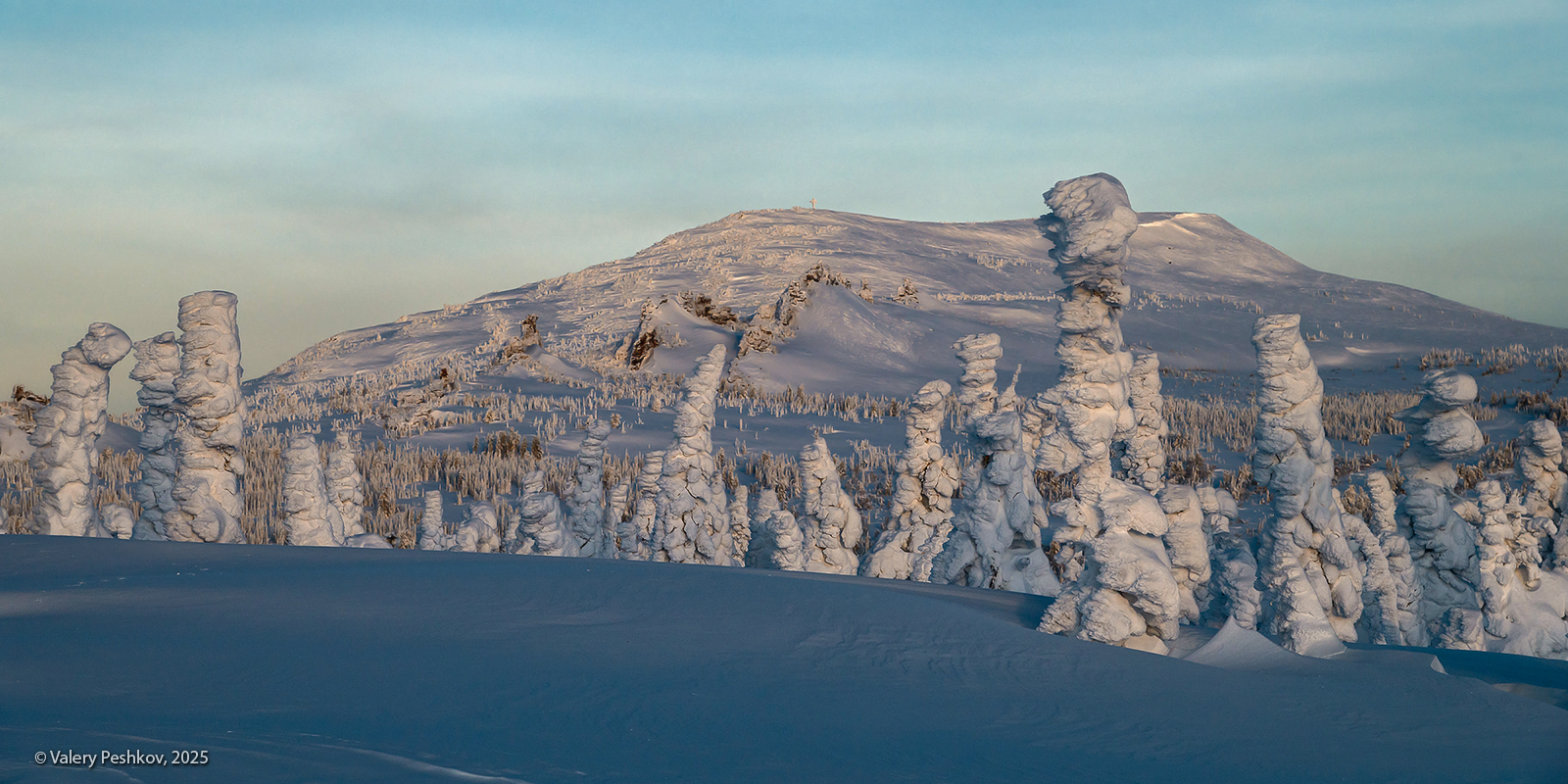 Пихты, обледеневшие до неузнаваемости, — как будто из другого времени. А гора Зелёная, будто вырезанная из камня и покрытая снегом, — в обоих снимках она разная, но всегда впечатляющая.