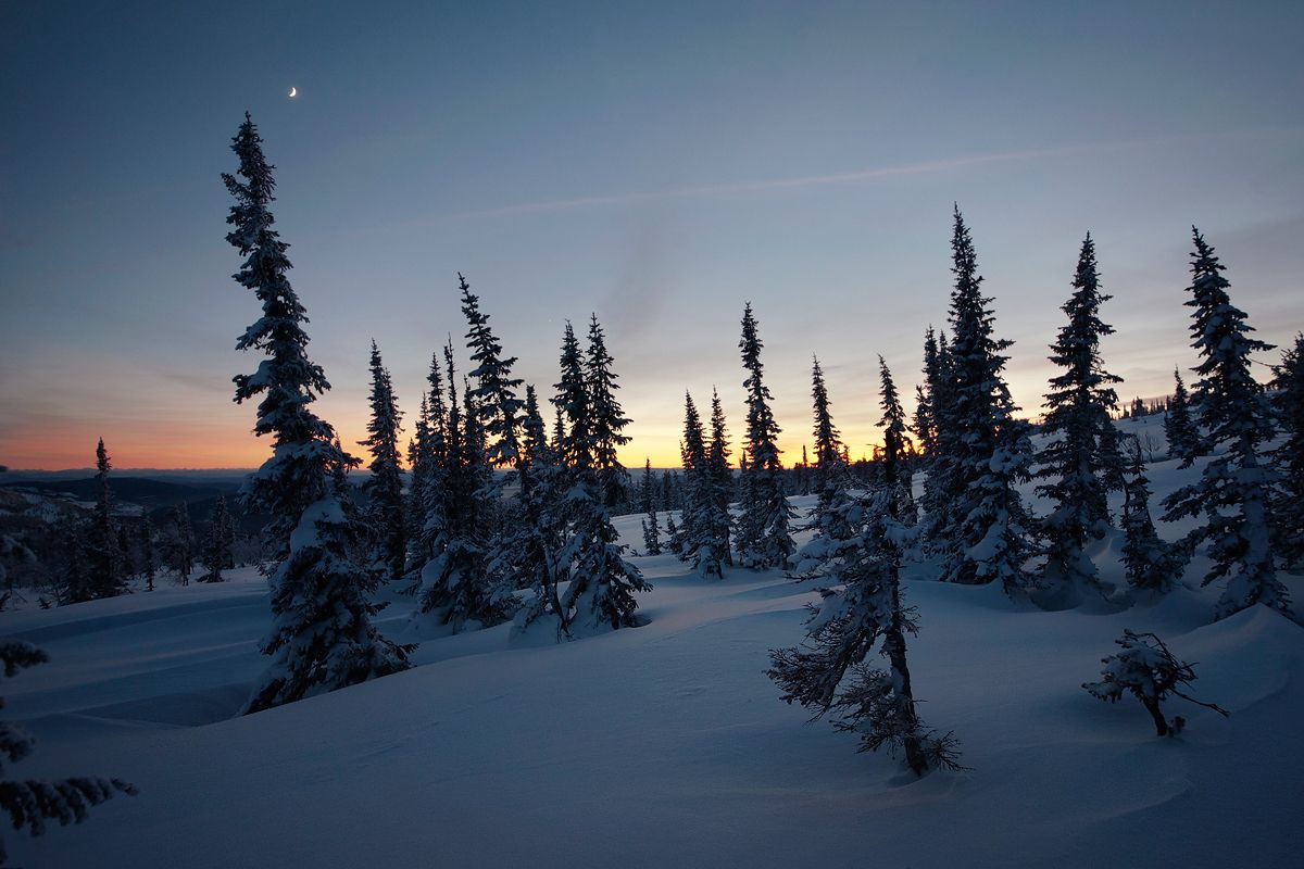Сибирское солнце ушло за горизонт и наступила гармония сумерек. Почти полная, если бы не следы многочисленных лыжников и сноубордистов, исключить которые из кадра стало уже никак не возможно…