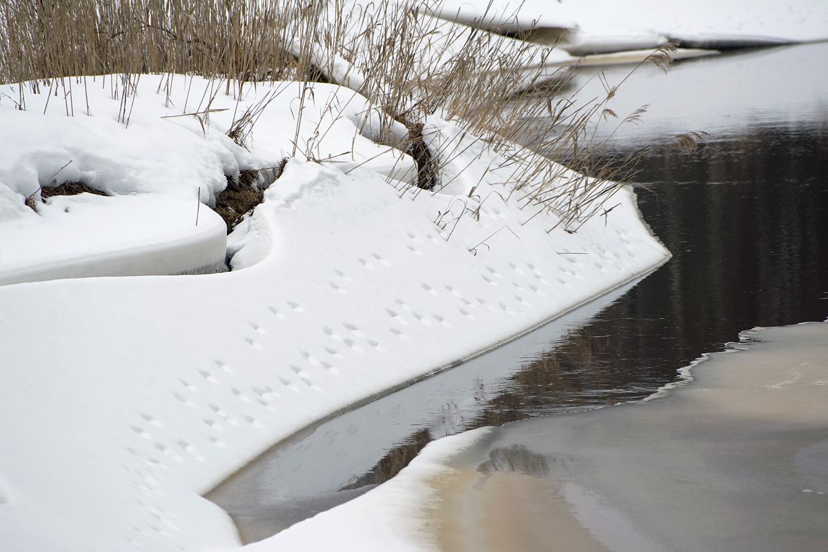 Элемент катастрофы тут явно есть: лёд, примёрзший к берегам, обламываясь, оторвал местами довольно большие куски дёрна и берега... Весенняя вода наверняка сильно размоет такие места. Посмотрим.