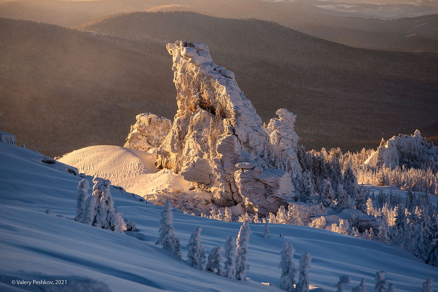 Погожее зимнее утро на скалах-останцах «Верблюдах» на склонах горы Курган над Шерегешем.