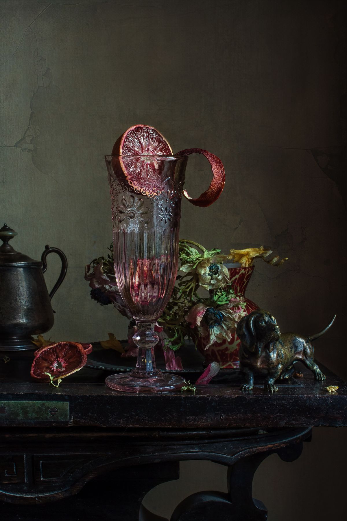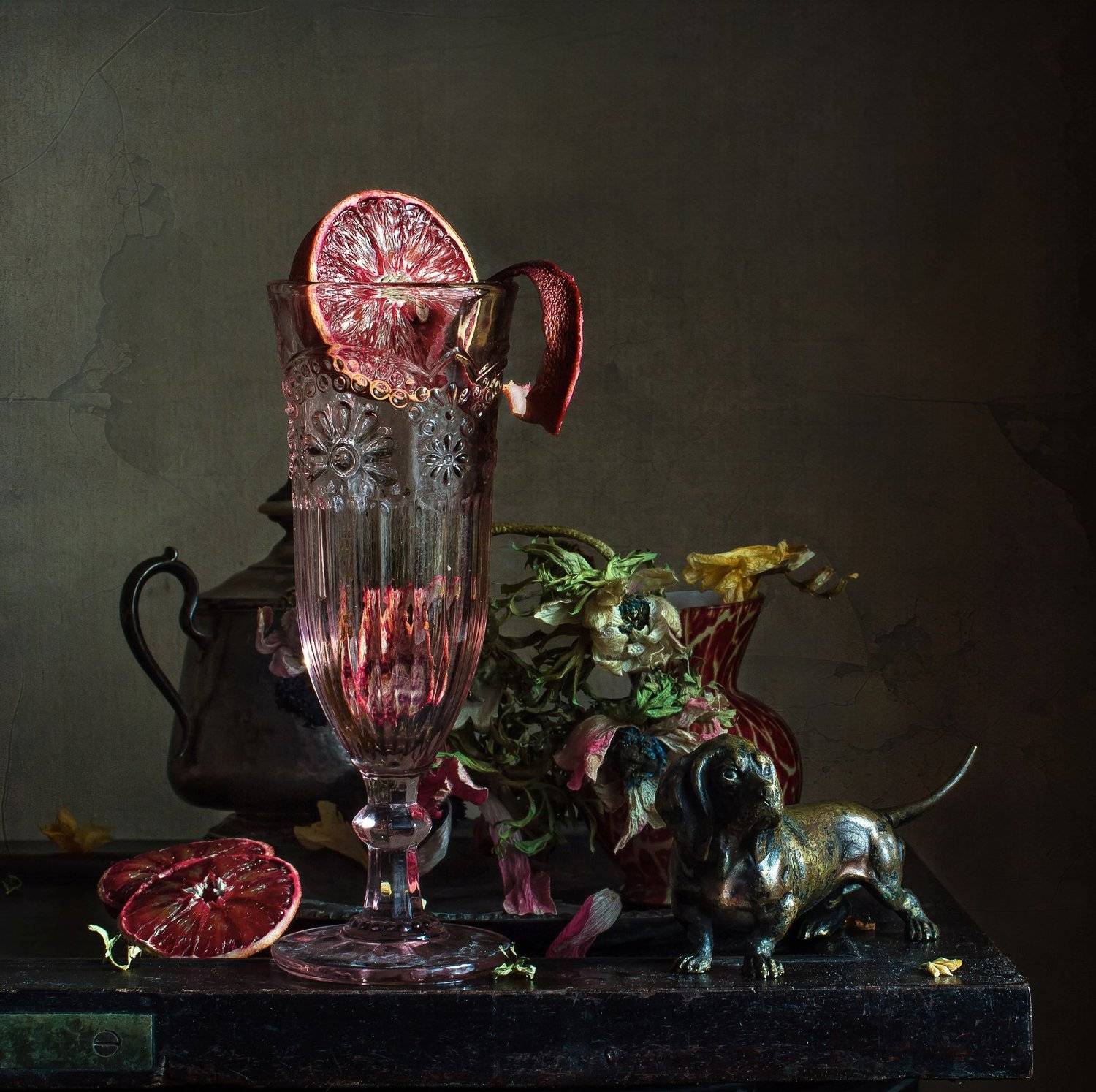 натюрмортстеклобронзастатуэткасобачкацветыанемоныапельсин