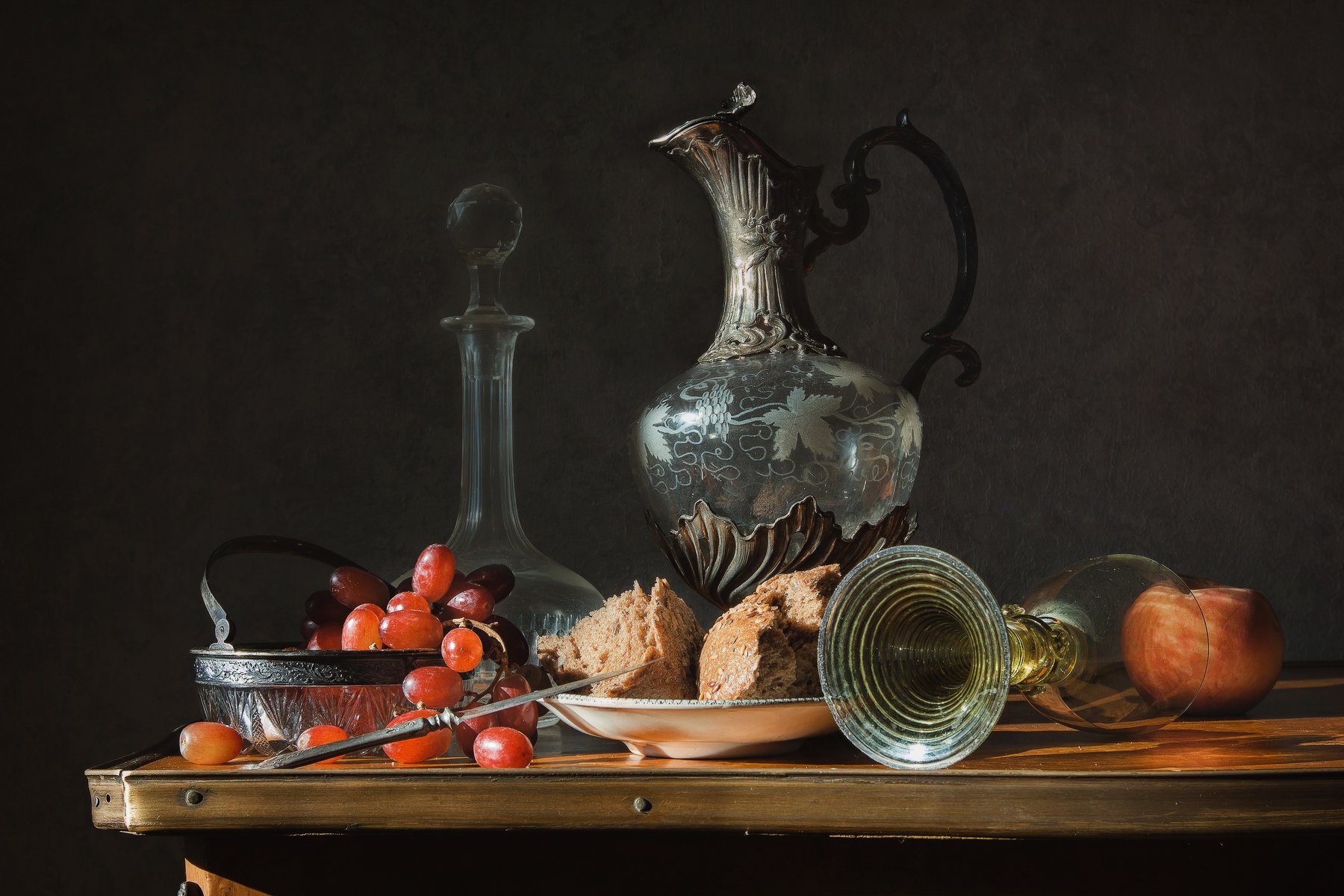 натюрморт, стекло, кувшин, виноград, хлеб, Анна Петина