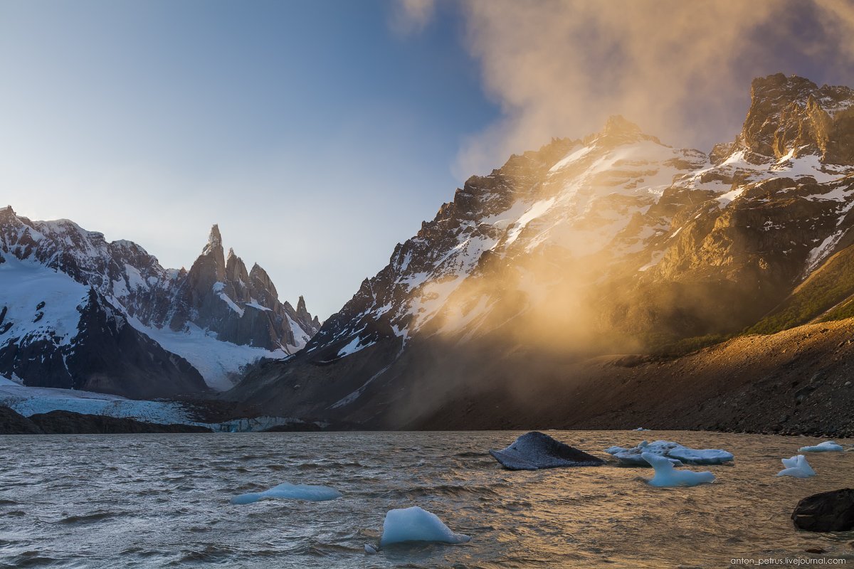 На тропе встретили рейнджера, он предупредил, чтобы мы не лезли никуда, кроме берега озера, иначе сдует к чертям. Ближе к закату мы вышли на берег озера Торре, сквозь ураганный ветер. И обомлели - с морены (каменистый склон на фото) летели тучи пыли! Со свистом и спецэффектами. В свете заходящего солнца это выглядело просто феерично. Ну кто скажет, что вот это милое облачко на фото на самом деле туча грязи?)