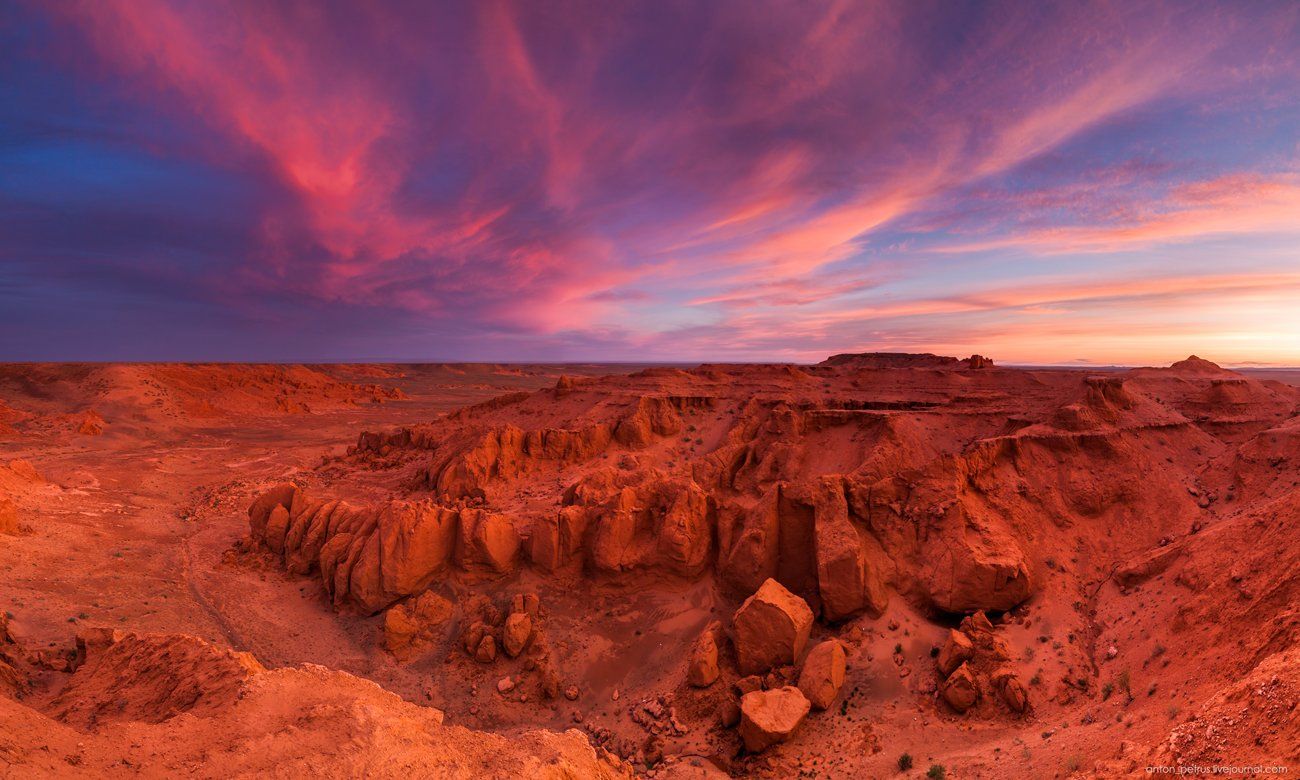 Уникальный каньон Баянзаг, Монголия, совершенно дикого красного цвета. Это место известно так же как кладбище динозавров, где можно найти их окаменевшие яйца и кости.