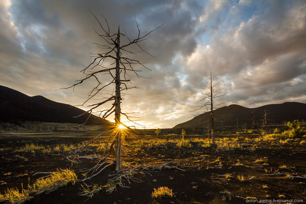 Мертвый лес на склонах Толбачика. Прошло уже больше 40 лет после извержения, уничтожевшего тайгу, и жизнь снова расцветает между призрачных деревьев.