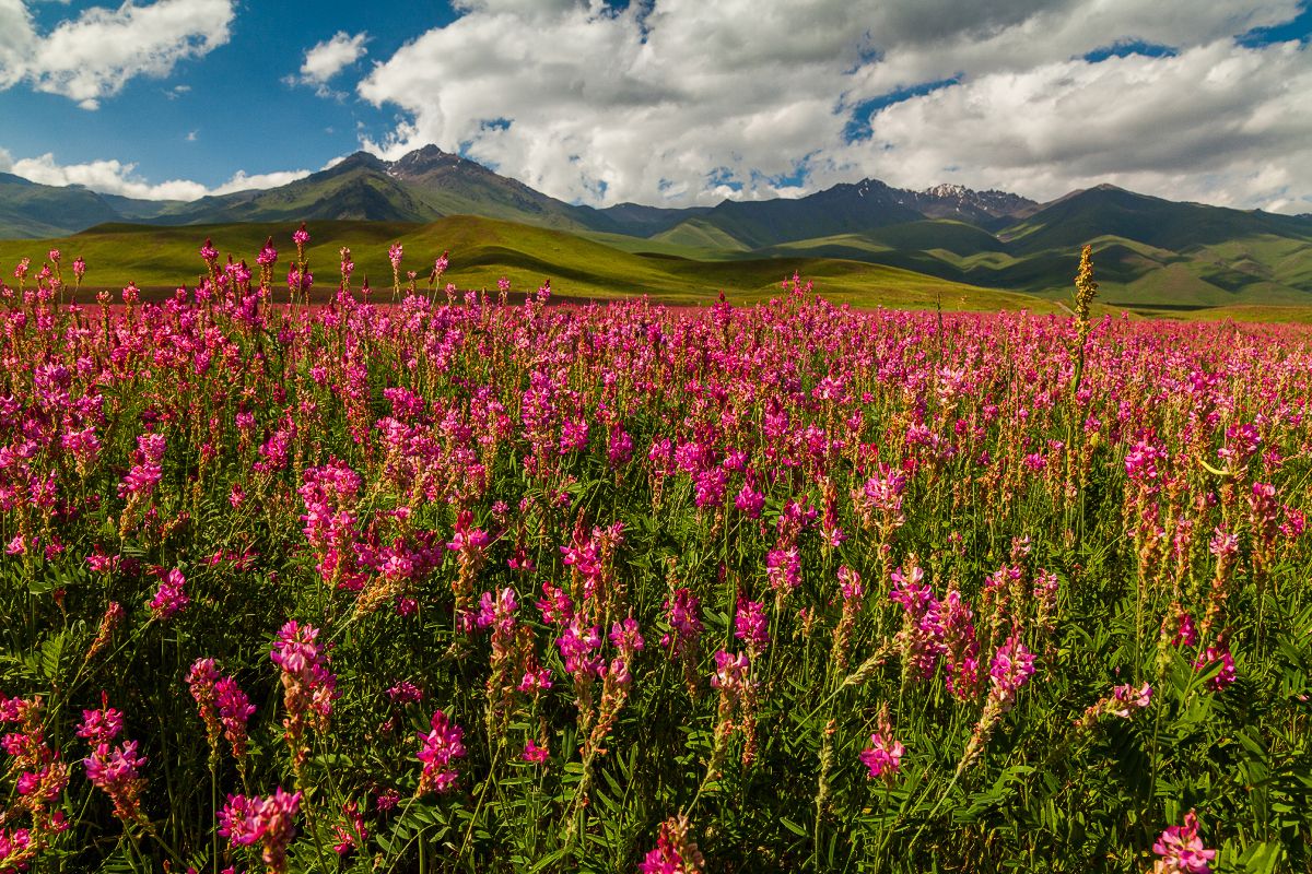 Вот такой Киргизия показалась в первый день нашего путешествия. Пейзажи - как с какого-то попсовенького настенного календаря) Зеленые горы, цветочки, белые облачка. Я вообще очень люблю в таких полянках поснимать. Еще бы лучше лечь там где-то в кустиках и наблюдать за мерным движением облаков. И тихонечко заснуть, под мелодию легкого ветерка...