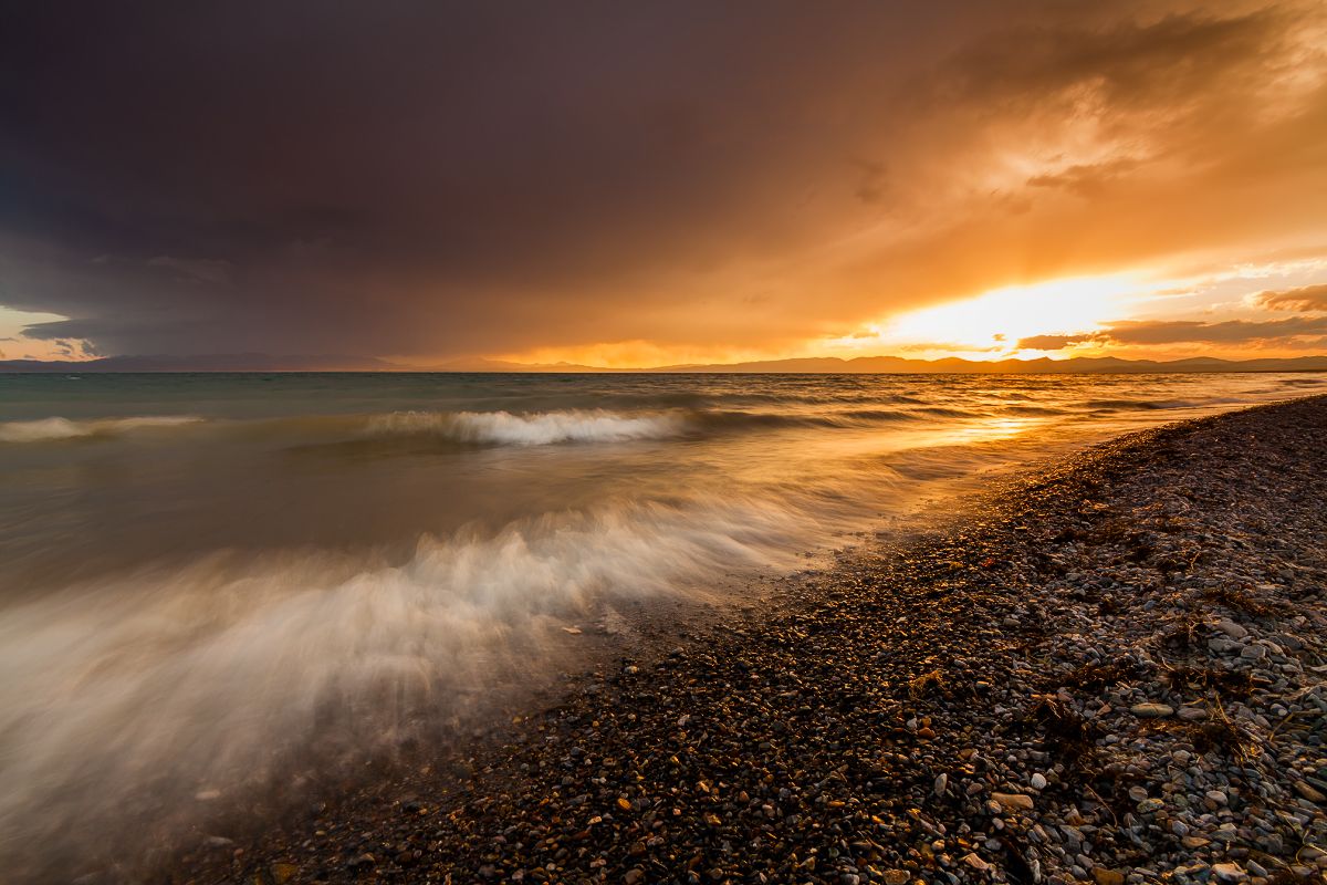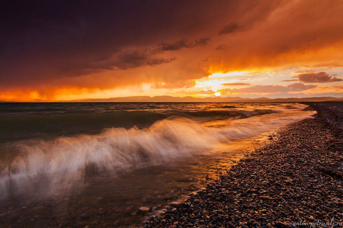 Просто огонь! А не закат был у нас на берегу озера Сон-Куль. Высокогорное озеро, на высоте более 3000 метров, в окружении зеленых берегов, покрытых ковром эдельвейсов. На небе дождило, на воде штормило. А свет был волшебный - все как я люблю, драма просто.