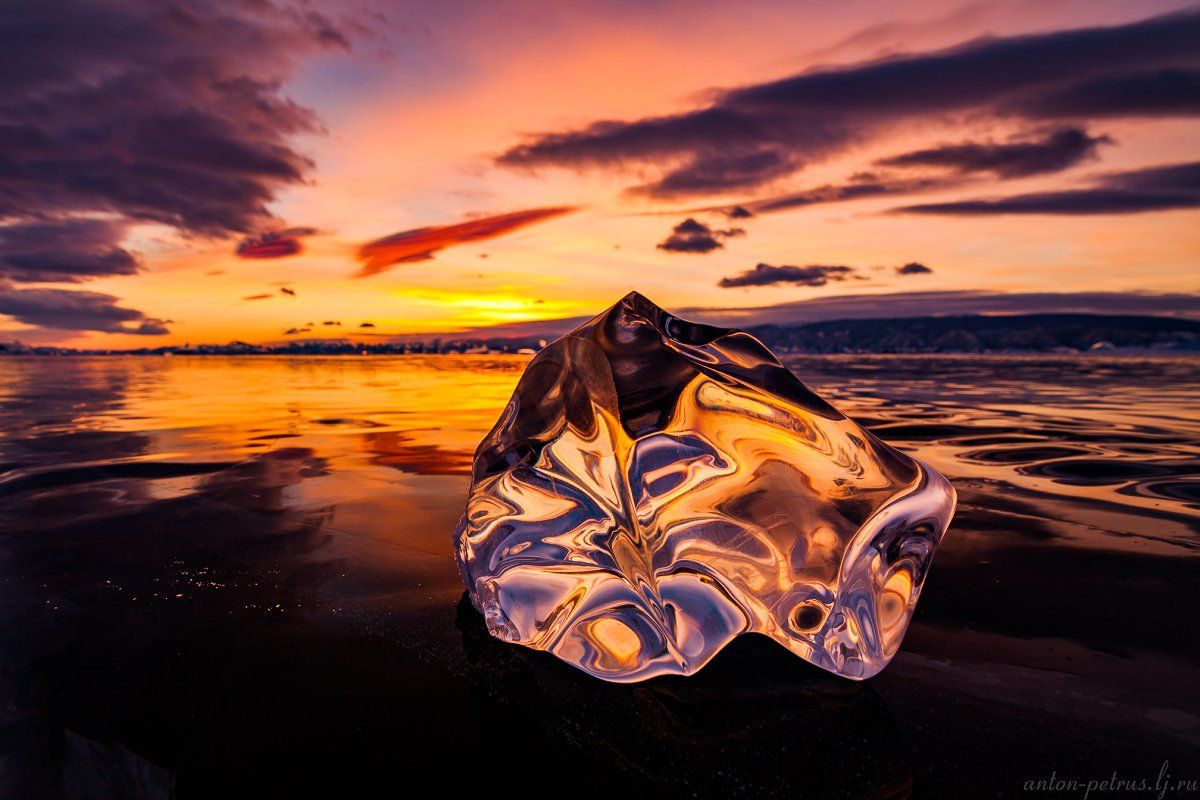 Вот такой чистейший кристалл я снимал как-то на льду Байкала. В нем отражается целый мир, в этих изгибах можно просто потеряться...