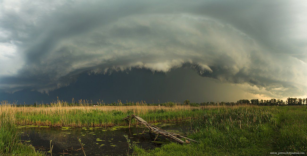 Об удаче и погоде. Прошлая неделя радовала грозами, удивительными облаками и молниями. И так получилось, что свою лучшую фотографию в этом году я снял не за тридевять земель, а 5 минутах ходьбы от дома. На фото - грозовой воротник. облако, которое предвещает шквал, ливень и все ужасы непогоды. Этот грозовой фронт принес шквал - сильный ветер лупил в лицо, капли были похожи на градины, наверно синяки остались )) Последние кадры панорамы отсняты и я побежал домой. Но не добежал - ветер просто с ног валил, а дождь летел параллельно земле... Я пришел домой мокрый, но счастливый