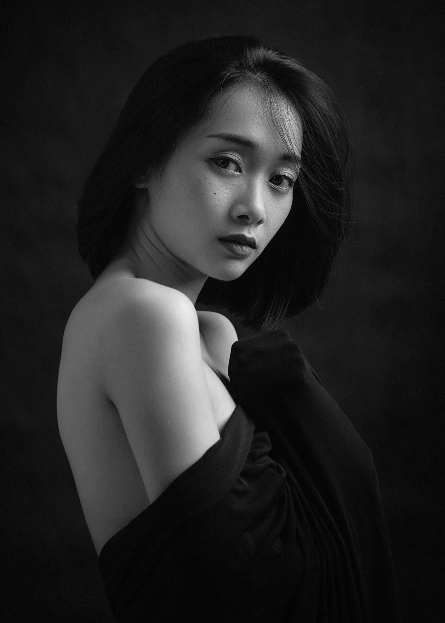 portrait, female, woman, girl, asian, vietnam, vietnamese, young, face, beauty, glamour, studio, eyes, black and white, bw, monochrome, mood, Hoang Viet Nguyen