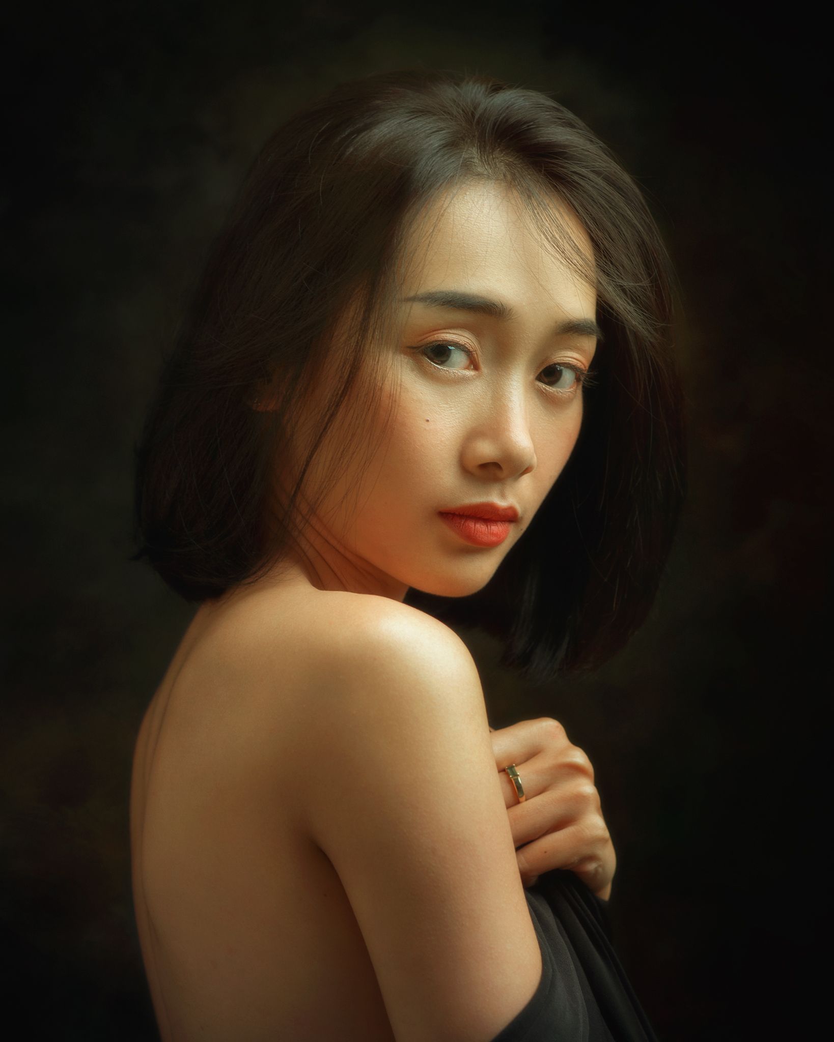 В этом студийном портрете молодая женщина из Вьетнама смотрит прямо в камеру с мягким, задумчивым взглядом. Фотограф Nguyen Hoang Viet использовал приглушённый свет и тёмный фон, чтобы создать интимную атмосферу и акцентировать внимание на выражении лица модели. Композиция подчёркивает естественную красоту и эмоциональную глубину — характерные черты современного фотожурналистского подхода к портрету.